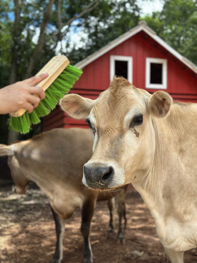 Uma atividade tranquila e afetuosa que permite interagir e cuidar das vaquinhas da Fazendinha, fortalecendo o vínculo entre pessoas e animais.
